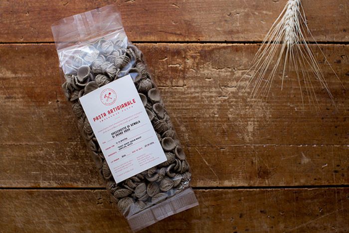 This orecchiette are made with savory burnt wheat. Traditionally, burnt wheat is obtained by milling durum wheat grains gathered from the fields after the stubble is burnt. Nowadays, they are obtained via toasting, which is a safer process. The gray flour smells slightly smoky and has a nutty flavor.