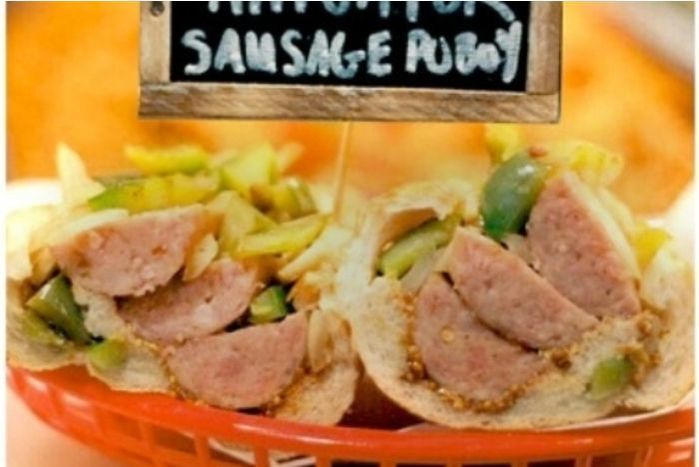 Alligator Sausage, Onions, Roasted Red Peppers and Home-Made Mustard.