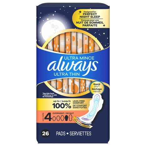Always Always Ultra Thin Overnight Pads, Size 4, Overnight, Unscented, 26 Count - 26 Pads
