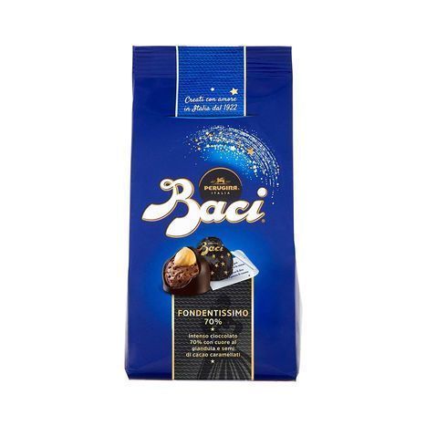 The 70% Dark Bacio from Perugina is a bittersweet chocolate with a rich and velvety smooth coating. Filled with a whole hazelnut atop creamy gianduja and chopped hazelnut filling. Unwrap a Baci and discover messages of love and friendship written by a philosopher, classical author, or contemporary artist inside the wrapper.