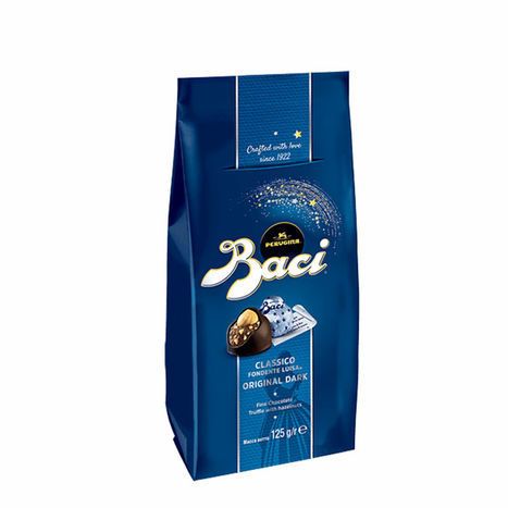 The Dark Chocolate Bacio from Perugina is a bittersweet chocolate with a rich and velvety smooth coating. Filled with a whole hazelnut atop creamy gianduja and chopped hazelnut filling. Unwrap a Baci and discover messages of love and friendship written by a philosopher, classical author, or contemporary artist inside the wrapper.nnEnjoy it as a chocolate bite dessert with wine, or give this delicious Bacio as a gift to your friends.nnCompany History:nIn 1922, Luisa Spagnoli invented the perfect little chocolate with a message of love hidden inside for her secret lover, Giovanni Buitoni. The little chocolate was fittingly named Baci, Italian for kisses. Today,ÔøΩPeruginaÔøΩstill produces Baci, beloved across the world.
