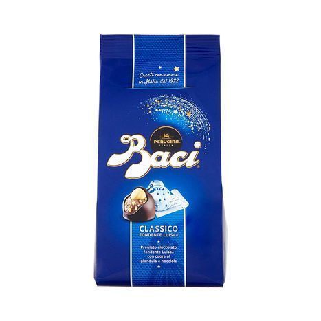 The Dark Chocolate Bacio from Perugina is a bittersweet chocolate with a rich and velvety smooth coating. Filled with a whole hazelnut atop creamy gianduja and chopped hazelnut filling. Unwrap a Baci and discover messages of love and friendship written by a philosopher, classical author, or contemporary artist inside the wrapper.\n\nEnjoy it as a chocolate bite dessert with wine, or give this delicious Bacio as a gift to your friends.\n\nCompany History:\nIn 1922, Luisa Spagnoli invented the perfect little chocolate with a message of love hidden inside for her secret lover, Giovanni Buitoni. The little chocolate was fittingly named Baci, Italian for kisses. Today,ÔøΩPeruginaÔøΩstill produces Baci, beloved across the world.