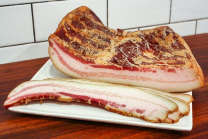 All of our pigs come directly from two small family farms in Upstate New York. Our farmers raise Berkshire and other heritage breed crosses?varieties which thrive outdoors and provide rich, meaty pork with superior marbling. Each week the whole animals are brought to our Chelsea Market store for butchering. We aim for as close to zero waste as possible with all of our animals. All of our bacon, ham, sausages and charcuterie are made in-house by our chef's Will & Jonas and team using the same high-quality, locally-raised, heritage pork.