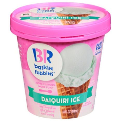 Lime flavored ice with a splash of rum flavoring. Natural and artificial flavors added. Dairy free. Fat free. More flavors. More fun. Since Baskin-Robbins opened its first ice cream shop in 1945, it has become an American favorite. Now, you can enjoy the fun and great flavors of Baskin-Robbins at home anytime. Daiquiri Ice: The classic cocktail is now scoopable and ready to refresh! We blend tangy lime puree with a splash of rum flavoring to bring you a dairy free, fat free dessert bursting with flavor. Happy hour in every bite! baskinrobbinsathome.com. 1-800-681-4925. 8 am - 5 pm CT. Get more information at baskinrobbinsathome.com.