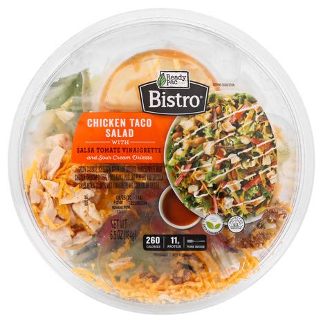 Chicken taco salad with salsa tomate vinaigrette and sour cream drizzle. Green cabbage, iceberg green leaf lettuce. Roasted white meat chicken cheddar cheese, pinto beans poblano peppers and tortilla chips with a salsa tomato vinaigratte and sour cream drizzle. 260 calorie; 11 g protein. Fork inside. Inspected for wholesomeness by US Department of Agriculture. www.readypac.com. Fresh Air Seal. Lets veggies breath.