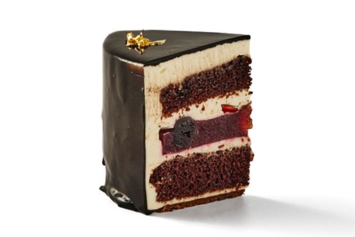Dark chocolate cake & white chocolate ganache, layered Amarena cherry gelee.