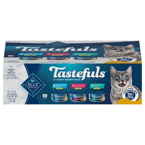Blue Buffalo Natural Flaked Chicken Entrees in Gravy/Fish and Shrimp Entrees in Gravy/Tuna Entrees in Gravy Food for Cats Variety Pack - 12 x 5.5 Ounces