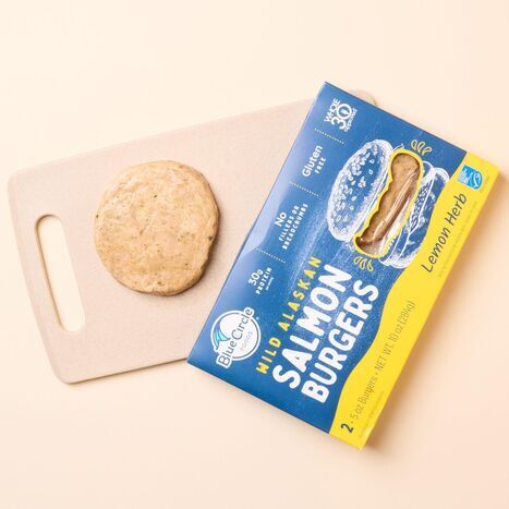 Sustainably caught, Wild Alaskan Pink Salmon patty, seasoned with lemon, rosemarry and garlic. [Description Provided by Blue Circle.]
