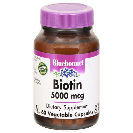 Dietary Supplement. Gluten free. Vegan. Made with non GMO ingredients. Bluebonnet's Biotin 5000 mcg Capsules contain yeast-free biotin in its purest crystalline form. Available in easy-to-swallow vegetable capsules for maximum assimilation and absorption. Free of milk, egg, fish, crustacean shellfish, tree nuts, peanuts, wheat and soybeans. Also free of corn, yeast, gluten, barley, rice, sodium and sugar. Bluebonnet's KOF-K Certification K-0000700. www.bluebonnetnutrition.com.