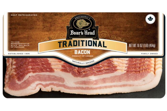 Crafted with top-quality pork belly, this bacon is smoked with hardwood chips and cooked to perfection. Boar's Head® Naturally Smoked Bacon packs farm-fresh flavor into each slice. Cured with: Water, Salt, Sugar, Sodium Phosphates, Sodium Erythorbate, Sodium Nitrite.