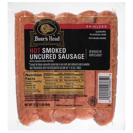 Boar's Head Sausage, with Crushed Red Peppers, Hot, Smoked, Uncured, Skinless - 16 Ounces