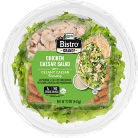 Romaine Lettuce, Caesar Dressing (Soybean Oil and/or Canola Oil, Water, Parmesan Cheese [Pasteurized Milk, Cheese Cultures, Salt, Enzymes], Distilled Vinegar, Whole Egg, Anchovies [Anchovies, Salt], Red Wine Vinegar, Contains Less than 2% of: Calcium Disodium EDTA [to Protect Flavor], Dehydrated Garlic, Dijon Mustard [White Distilled Vinegar, Water, Mustard Seed, Salt, White Wine, Citric Acid, Onion Powder, Spices, Turmeric Natural Flavors], Egg Yolk, Extractive of Rice, Inverted Sugar, Lemon Juice Concentrate, Natural Flavors, Salt, Sodium Benzoate and Potassium Sorbate [as Preservatives], Spices [Contains Mustard], Xanthan Gum), Chicken Breast with Rib Meat (Chicken Breast Meat with Rib Meat, Water, Sodium Lactate, Seasoning [Salt, Sugar, Artificial Chicken Flavor {Hydrolyzed Corn Protein, Autolyzed Yeast Extract, Thiamine Hydrochloride, Disodium Inosinate, Disodium Guanylate}, Dextrose, Natural Flavoring], Modified Potato Starch, Dextrose, Potassium Lactate, Sodium Phosphates, Sodium Diacetate), Butter Garlic Crouton (Enriched Flour [Wheat Flour, Malted Barley Flour, Niacin, Reduced Iron, Thiamin Mononitrate, Riboflavin, Folic Acid], Canola and/or Sunflower Oil [with Rosemary Extract and Ascorbic Acid {to Preserve Freshness}], Yeast, Sugar, 2% or Less of Salt, Garlic (Dehydrated), Onion Powder, Parsley (Dehydrated), Natural Flavors [Milk], Yeast Extract, Dextrose, Butter Oil, Enzymes, Extractive of Annatto [Color], Natural Smoke Flavor), Parmesan Cheese (Parmesan Cheese [Pasteurized Milk, Cheese Cultures, Salt, Enzymes], Powdered Cellulose [to Prevent Caking]).