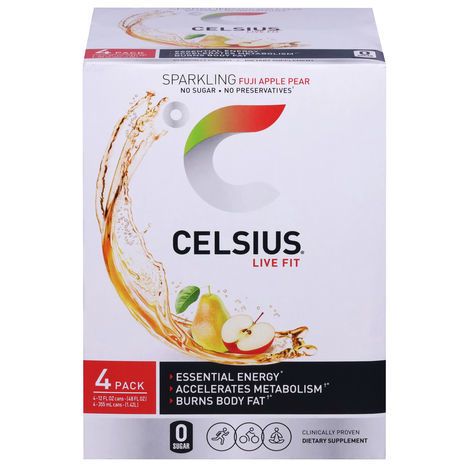 Celsius Energy Drink, Sparkling, Fuji Apple Pear, 4 Pack - 4 x 12 Fluid Ounces