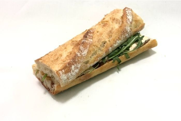 One third of a rustic sweet baguette with fig jam, arugula, and Cowgirl Creamery's dreamy triple creme cheese, Mt. Tam.