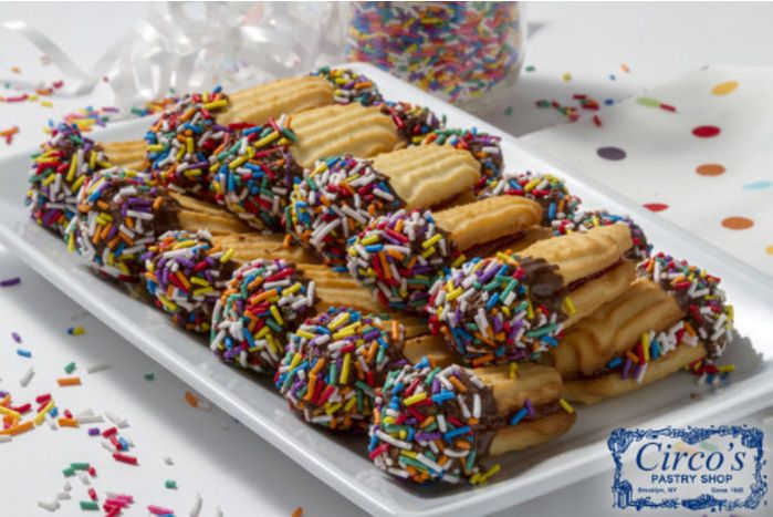 Chocolate Dipped Butter Cookie Jelly Sandwich with Rainbow Sprinkles