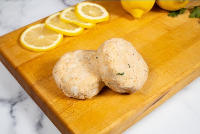 Full of pasteurized lump crab meat w/ a touch of Dijon mustard, mayo, lemon, parsley, Old Bay seasoning & panko breadcrumbs. To cook: Heat enough oil over medium-high heat to coat the bottom of a sauté pan. Cook for 3-4 mins per side.