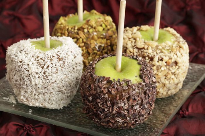 Crushed Chocolate Chip Cookie Chocolate Caramel Apples with White Chocolate String