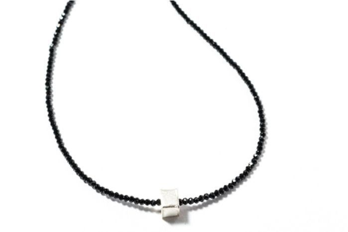 This is an absolute studio favorite. A stunning combination of black spinel with a single cube of sterling silver. The adjustable clasp allows this piece to work with any neckline.