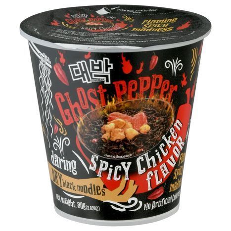 Daring. Flaming spicy madness. No artificial coloring. Do you fear the Ghost Pepper? Take the dare and challenge other souls into the depth of spiciness. Eat at your own risk! (hashtag)canornotchallenge. Scoville heat unit for peppers: 1,000,000 ghost pepper; 350,000 orange habanero; 50,000 cayenne; 8,000 jalapeno; 0 bell pepper. (hashtag)canornotchallenge Warning! 1. Eat it: Empty the Ghost Pepper Spicy Chicken cup into your stomach. 2. Survive it: Take a video of you struggling to finish the whole cup. 3. Announce it: Post it and tag (at)Daebak noodles on social media and include (hashtag)canornotchallenge to be chosen as the lucky winner. Pray hard & visit Facebook. Instagram: Daebaknoodles for more details. Product of Malaysia.