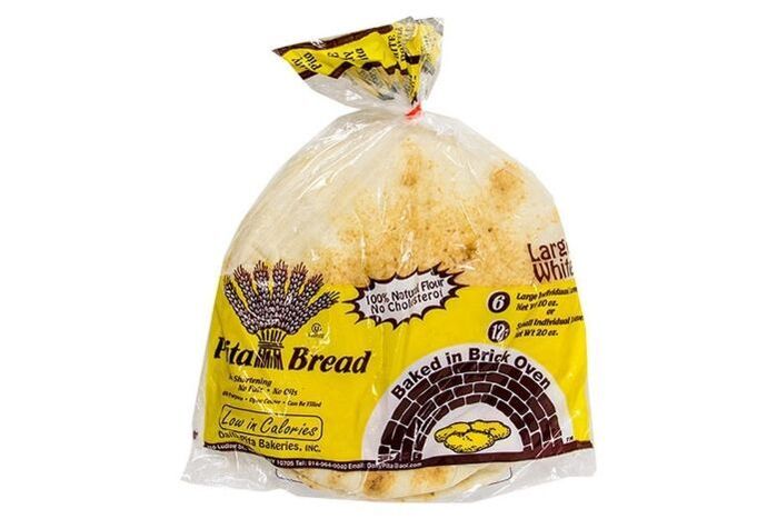 Delicious low calorie, 100% natural, brick oven baked, white pita bread. Pair this with the hummus bi tahini for the perfect treat!