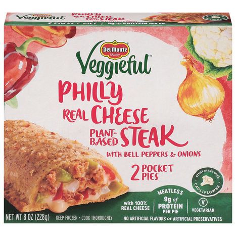 Crust: Enriched Wheat Flour (Wheat Flour, Niacin, Reduced Iron, Thiamine Mononitrate, Riboflavin, Folic Acid), Cauliflower (Water, Cauliflower Flour), Palm Oil, Dehydrated Onion, Olive Oil, Whey, Sugar, Salt, Yeast, Garlic Powder, Spice, Filling: Textured Vegetable Protein (Water, Soy Protein Concentrate, Caramel Color), Water, Provolone Cheese (Pasteurized Milk, Cheese Cultures, Enzymes, Salt, Calcium Chloride), Green Bell Peppers, Onions, Red Bell Peppers, Rochester Sauce (Distilled Vinegar, Corn Syrup, Water, Salt, Garlic Powder, Spices, Celery Seed, Tamarind, Natural Flavors), Low Moisture Part-Skim Mozzarella Cheese (Cultured Pasteurized Part-Skim Milk, Salt, Enzymes), Cream, Corn Starch, Oat Fiber, Butter (Cream, Salt), Salt, Yeast Extract, Onion Powder, Garlic Powder, Natural Flavors, Spice.