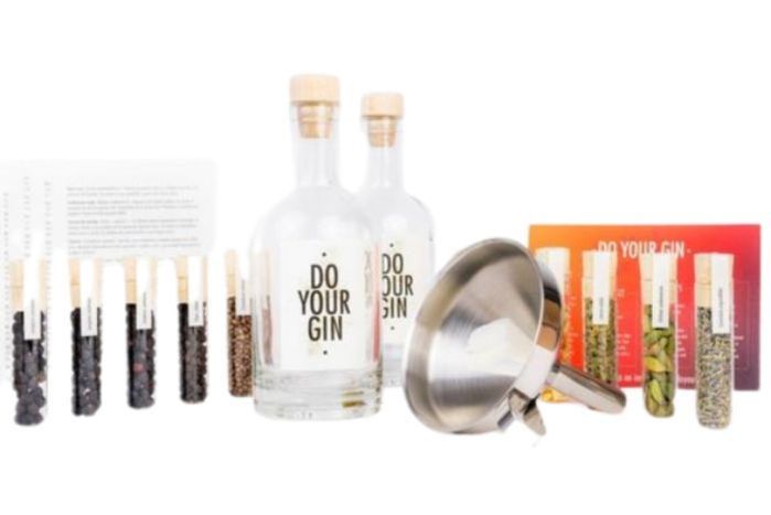 DIY kit to make gin, 12 botanicals, 2 glass bottles and 1 funnel"