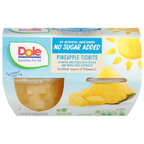Dole Pineapple Tidbits, No Sugar Added - 4 x 4 Ounce Cups