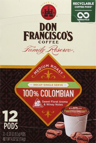 Don Francisco's Coffee, Medium Roast, 100% Colombian, Decaf, Single Serve Pods - 12 x 0.33 Ounces