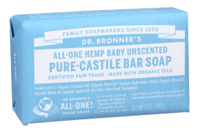 Dr. Bronner's All One Pure Castile Hemp Unscented Baby Soap. With no added fragrance and double the olive oil our All One Pure Castile Hemp Unscented Baby Bar Soap is good for sensitive skin & babies too (Though not tear-free!). Dr. Bronner's Bar Soap is made with certified fair-trade ingredients and organic hemp oil for a soft smooth lather that won't dry your skin. 100% biodegradable in a 100% post-consumer recycled wrapper.