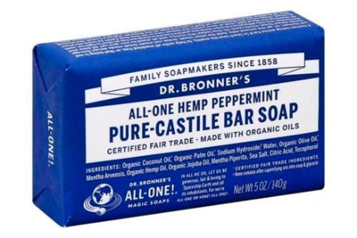 Dr. Bronner's All One Pure Castile Hemp Peppermint Bar Soap. Our most popular scent with a Peppermint burst so pure it tingles! Scented with Organic Peppermint Oil to cool skin clear sinuses and sharpen the mind. Our peppermint pure-castile bar soap is made with certified fair-trade ingredients and organic hemp oil for a soft smooth lather that won't dry your skin. 100% biodegradable in a 100% post-consumer recycled wrapper.