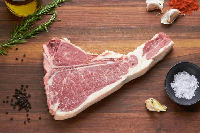 A thick cut from the short loin area, the porterhouse is comprised of the two most prized portions of meat: the tenderloin and the short loin. Being prime-grade, this steak features exquisite marbling throughout, and the dry-aging process concentrates the flavor and improves the texture even further. Best prepared grilled with a crust of sea salt and freshly ground pepper, allowed to rest for 5-10 minutes before serving.