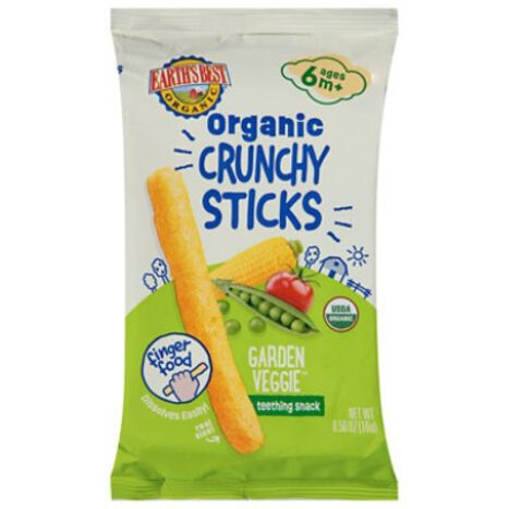 Ages 6+ months. USDA Organic. Certified Organic by Organic Farmers & Growers CIC GB-ORG-02. Finger food. Dissolves easily. Real size! When your little one is comfortable picking up food, the next challenge for them is to get it into their mouth! These sticks will help them perfect this skill. Why not encourage them with some fun sounds as they play & learn? www.earthbest.com. Facebook. Instagram. Join the Earth's Best family at www.earthbest.com. Reach out to us! 800-442-4221. Three Fun Flavors: Strawberry Banana; Cheddar Cheese; Garden Veggie. Product of the U.K.