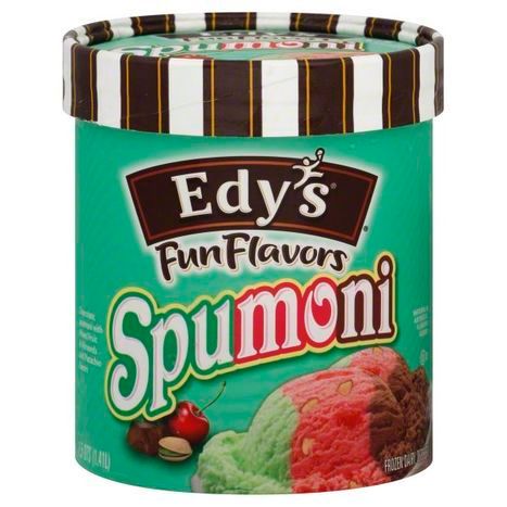 Whey (Dairy) Skim Milk Cream Sugar Corn Syrup Spumoni Fruit (Pineapple, Corn Syrup, Grapes, Maraschino Cherries, High Fructose Corn Syrup, Natural and Artificial Flavor, Cellulose Gum, Dextrose, Modified Corn Starch, Carrageenan, Disodium Phosphate, Red 40) Maltodextrin Roasted Almonds (Almonds, Partially Hydrogenated Soybean Oil) Cocoa Processed with Alkali Propylene Glycol Monostearate Guar Gum Natural Flavor Monoglycerides High Fructose Corn Syrup Pistachio Paste Yellow 5 Cherry Juice Concentrate Red 40 Blue 1 Xanthan Gum Caramel Color Soy Lecithin Carrageenan