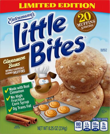 Limited Edition. Per 1 Pouch Serving: 190 calories; 1.5 g sat fat (8% DV); 170 mg sodium (7% DV); 18 g total sugars. 0 g Trans fat. No high fructose corn syrup. New! Seasonal favorites. 5 pouches. www.littlebites.com. www.littlebites.com/about/terracycle. SmartLabel: Scan for more food information. Follow us at: Facebook. Instagram. Pinterest. fb.com/LittleBitesSnacks. We are committed to providing you with quality products and welcome your questions and comments. Call 1-800-984-0989, Consumer Relations Department. When writing, please include the Proof-of-Purchase (Bar Code) and stamped date code. For more information visit us at: www.littlebites.com. Turn used snack pouches into money for your school. Earn $0.02 per donated pouch for the school or charity of your choice. BCTGM: Bakery Confectionery Tobacco Workers & Grain Millers union made. AFL CIO CLC. What's your favorite? Entenmann's Little Bites Chocolate Chip Muffins; Entenmann's Little Bites Fudge Brownies; Entenmann's Little Bites Blueberry Muffins; Entenmann's Little Bites Party Cakes. Please recycle this carton when possible. Recycling facilities for this carton may not be available in your area. Terracycle. www.littlebites.com/about/terracycle.