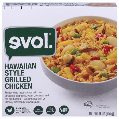 White rice, grilled white meat chicken. Pineapples, edamame, water chestnuts and red bell peppers - all combined with an insanely tasty pineapple teriyaki sauce. No preservatives. Gluten free. 13 g protein. Chicken raised without antibiotics. Inspected for wholesomeness by US Department of Agriculture. Nothing artificial. New. So many options. Not enough freezer space. Love what you eat. We make real food with simple, easy to recognize ingredients and big taste. We care about where our ingredients come from and how they are produced - because every eating experience should feel good and be worth sharing. Go ahead, Love what you eat! Meet Our Chicken. Our chicken is raised in the USA without the use of antibiotics and never fed animal by-products. 3 points. Collect points and redeem for Evol gear. Visit evolfoods.com to find out how. When corresponding about this product, please include the best by date. Please recycle. Our bowls are made from recyclable CPET plastic. evolfoods.com. Follow us on Facebook; Twitter; Instagram. Sustainable Forestry Initiative: Certified sourcing. www.sfiprogram.org. evolfoods.com. boulderbrands.com.