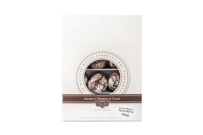 Soft Chocolate Amaretti from La Fabbrica del Panforte are dome-shaped cookies crisp and crunchy on the outside and soft, or ‘morbidi’ in Italian, on the inside. nThese artisan handcrafted cookies are made with only few ingedients: 42% of Almonds, Sugar, Egg White, 5% of Cocoa and Honey. If you have never before, now you need to try these tasty and exquisite Soft Chocolate Amaretti!nnnLa Fabbrica del Panforte was founded in 1994 with the aim to promote the unique confectionery culture of Siena. This small medieval city is known for delicious cuisine that is important to Tuscan’s local culture and history. To maintain authentic flavors, Fabbrica del Panforte uses simple, quality ingredients and recipes inherited from master bakers. These Sienese sweets are considered a hallmark of the nature, culture and lifestyle of the people of Siena: simple, sincere, and original. nnnDelicious on their own or enjoy them with coffee, tea, cappuccino or dessert wine.