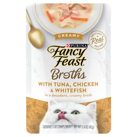 Fish Broth, Tuna, Chicken, Fish Extract, Whitefish, Milk, Modified Tapioca Starch, Potato Starch, Wheat Starch, Added Color, Salt, Sugar, Soy Protein, Vegetable Oil, Guar Gum, Xanthan Gum, Vitamin E Supplement, Egg Whites, Spice and Coloring, Thiamine Mononitrate.