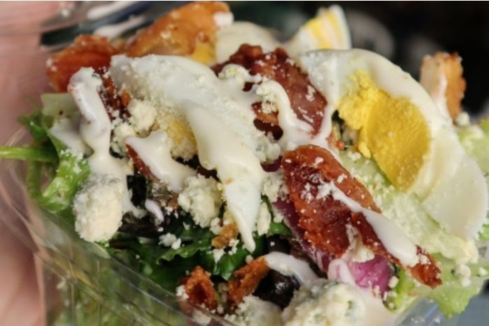 Field Greens, Romaine & Iceburg Lettuce, Hard Boiled Eggs, Applewood Smoked Becon, Onion Ring, Red Onion, Blue Cheese Crumbles, & Buttermilk Ranch Dressing