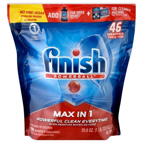 No pre-soak even on baked on pasta. World's no.1 recommended brand. Recommended by more dishwasher brands worldwide (More dishwasher brands recommended Finish products worldwide than any other brand. Recommendations as part of Co-marketing agreements). Powerful clean everytime. Even removes baked on food. 17x power actions for a superior clean & shine performance (vs Finish Deep Clean). Max in 1 14x: No need to pre-soak. Powerful cleaning. Cuts through grease. Prevents re-deposits. Attacks burnt on food. Removes dried-on leftovers. Cleans tea & coffee strains. No need to pre-rinse. Easy dosing. Septic safe. Chlorine free. Removes baked on food. Wrapper free. Glass protection. Scrubs toughest strains 1st time. Fast dissolving. Cleans in short cycles. 3 Steps for Perfect Results (When Used Together): 1. Clean it. Finish Max in 1 provides powerful clean everytime. 2. Dry it. Finish Jet-Dry dries dishes & prevents spots. 3. Maintain it. Finish dishwasher cleaner cleans & freshens the machine for clean dishes. No need to unwrap. Contains less than 0.5% phosphorus by weight. Health. Hygiene. Home. www.finishdishwashing.com. Questions? 1-800-228-4722. For ingredient and other information, www.finishdishwashing.com. Save your water! Scrape the dishes instead of pre-rinsing them and save up to 20 gallons of water for every full load. www.happier-homes.com. Container recyclable where recycling facilities exist. Made in USA.