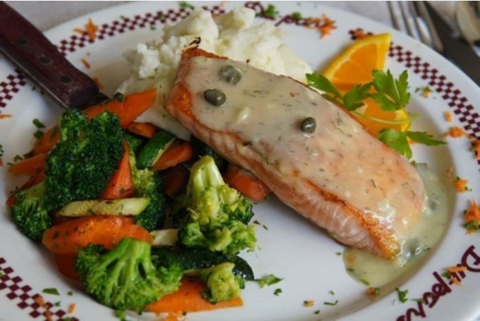 Fresh salmon fillet grilled in butter with a spritz of lemon and chopped dill. Served with fresh mashed potatoes and creamed spinach.