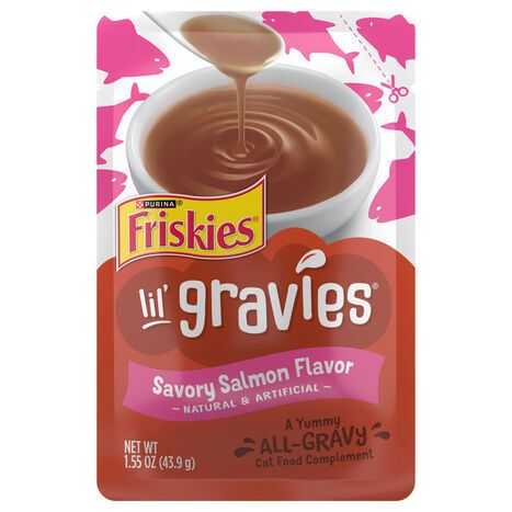 A yummy all gravy cat food complement. Easy to pour. A lil' gravy with a whole lotta flavor! www.Friskies.com. Purina.com. Visit us at www.Friskies.com. Try all 4 flavors. Also try another Lil' something. Lil' Grillers. Lil' Slurprises. Lil' Soups. Printed in USA. Calorie Content (calculated)(ME): 152 kcal/kg, 6 kcal/pouch.