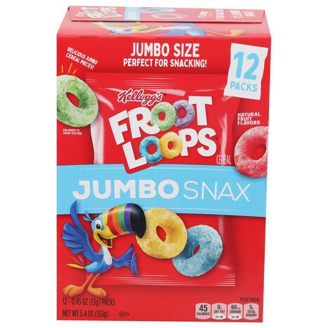 Natural fruit flavors. Per 1 Pouch: 50 calories; 0 g sat fat (0% DV); 60 mg sodium (3% DV); 5 g total sugars. New! Jumbo size perfect for snacking! Delicious! Your favorite cereal now made perfect for snacking! Yummy, crispy, crunchy! On the Go: Lunch time, game time, drive time. No high fructose corn syrup. Goodness of wholesome grains. kelloggs.com. how2recycle.info. Questions or comments? Visit kelloggs.com call 1-800-962-1413 Provide production code on package. Kellogg's Family rewards.