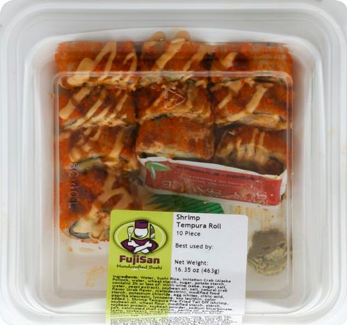 Water, Sushi Rice, Imitation Crab (Alaska Pollock, Water, Wheat Starch, Sugar, Potato Starch, Contains 2% or Less of: Mirin Wine (Sake, Sugar, Salt, Water, Yeast Extract), Soybean Oil, Salt, Natural Crab Flavor (Crab Flavor, Maltodextrin), Modified Food Starch, Potassium Chloride, Egg Whites, Citric Acid, Paprika Oleoresin, Lycopene, Soy Lecithin, Color Added), Shrimp Tempura Pre-Fried Tail Off (Shrimp, Soybean Oil, Wheat Flour, Modified Starch, Starch, Soybean Protein, Soybean Powder, Sodium Bicarbonate, Salt, Calcinated Shell Calcium, Perilla Oil, Emulsifier [Palm, Soybean], Mixed Tocopherols [Alpha, Beta], Riboflavin, Paprika Color), Cucumber, Avocado, Seasoned Vinegar (Sugar, Rice Vinegar, Salt, Brown Sugar), Mayonnaise (Soybean Oil, Water, Whole Eggs and Egg Yolks, Vinegar, Salt, Sugar, Lemon Juice, Calcium Disodium, EDTA {Used to Protect Quality}, Natural Flavors), Tempura Crunch (Water, Wheat Flour, Rice Four, Corn Starch, Soybean Oil, Salt, Color Red), Sesame Seed Toasted, Dried Hoshi Nori.
