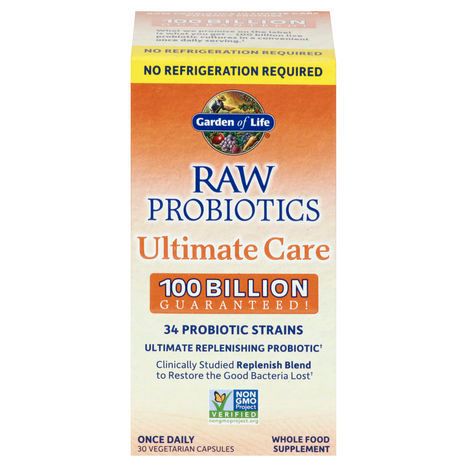 Whole Food Supplement Gluten-Free: Certified gluten-free by NSF. No binders, fillers, carriers, nor artificial colors or preservatives. Non GMO Project verified. nongmoproject.org. Non-GMO Verified: Independent third party verification. 34 probiotic strains. Ultimate replenishing probiotic. Clinically studied replenish blend to restore the good bacteria lost. Once daily. Potency promise. What we promise on the label is what you get - 100 billion live probiotic cultures in a convenient once daily serving (At expiration date under recommended storage conditions). Many factors can compromise your body's defenses, including the overuse of medications, stress, your environment and even normal aging, resulting in the loss of beneficial bifidobacterium. High Bifido Formula: Includes replenish blend to help repopulate your gastrointestinal tract with good bacteria. Clinically Studied Strains: 100 billion CFU, typically containing 34 probiotics with clinically studied species plus Eastern European wild kefir culture. Protein-Digesting Enzymes: For added digestive support. Maintaining a healthy bacterial balance in your digestive system is key to optimizing your overall well-being. Shelf Stable (At Expiration Date under Recommended Storage Conditions): New desiccant-lined bottle technology for shelf stable probiotics. Package size is determined by labeling information, not the number of servings in this container. The serving size and contents are clearly marked. 100 billion guaranteed! www.gardenoflife.com Printed with vegetable based inks on 100% recycled material. Certified renewable energy. Green-e.org. We buy 100% certified renewable energy. (These statements have not been evaluated by the Food and Drug Administration. This product is not intended to diagnose, treat, cure or prevent any disease.)
