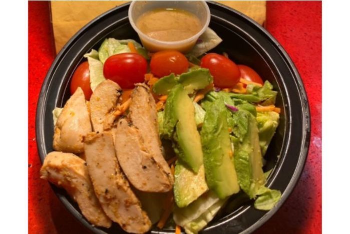 Our garden salad topped with our tender marinated grilled chicken breast and homemade vinaigrette. (All prices plus sales tax.)
