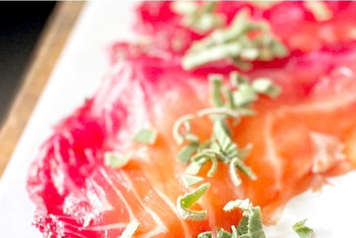 This is a true feast for the eyes. The flavoring of the beet is fleeting, umami like in an almost ephemeral way. We do not recommend the usual condiments with this gravlax, they will take over and be too strong. Serve nude, possibly with a quick lemon squeeze. It would do really well with boiled or roasted artichokes + a light mayo based vinaigrette.