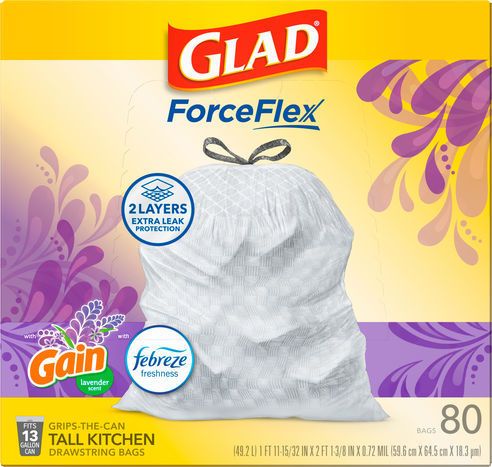 Glad Bags, Drawstring, Kitchen, Gain Lavender Scent with Febreze Freshness, 13 Gallon, Tall - 80 Bags