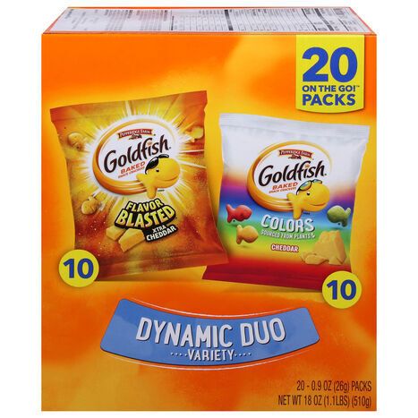Goldfish Baked Snack Crackers, Dynamic Duo Variety, Flavor Blasted Xtra Cheddar/Colors Cheddar, 20 On the Go! Packs - 20 x 0.9 Ounces
