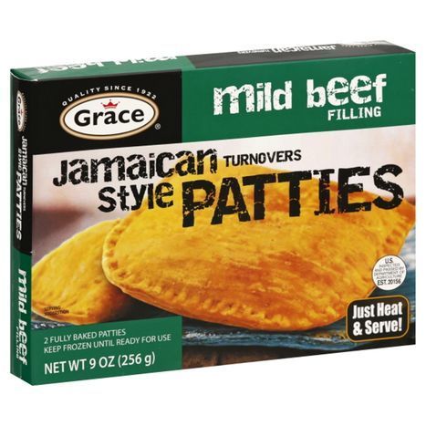 2 individually wrapped baked patties. Jamaican turnovers style patties. Quality since 1922. Just heat & serve! Jamaican patties are one of the most popular and delicious snack foods in Jamaica, and are rapidly being discovered and enjoyed the world over! Jamaican Style Patties are scrumptious, savory pastries with fillings made from any meat or vegetable, and baked inside a tender, flaky crust. The traditional and still the most popular filling is ground beef. Jamaican Style Patties are ideal for a light lunch or quick, convenient snack on-the-go any time of day! Baking in a conventional or toaster oven, produces the best results - for a crispy, flaky, delicious crust, but Jamaican Style Patties can also be heated in the microwave in just 1-1/2 minutes! Microwaveable. US inspected and passed by Department of Agriculture. Try Grace Jamaican Style Patties in 3 delicious flavors; Spicy Beef, Mild Beef & Curried Chicken! www.gracefoods.com. Facebook: www.facebook.com/gracefoods. Twitter: www.twitter.com/gracefoods. Product of USA.