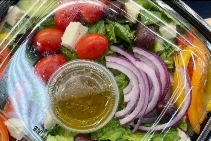 Greek Salad with Italian Dressing (Ing: Romaine Lettuce, Green Peppers, Grape Tomatoes, Red Onion, Feta Cheese, Kalamata Olives, Dressing: Garlic, Sea Salt, Black Pepper, Red Wine Vinegar, Olive Oil)